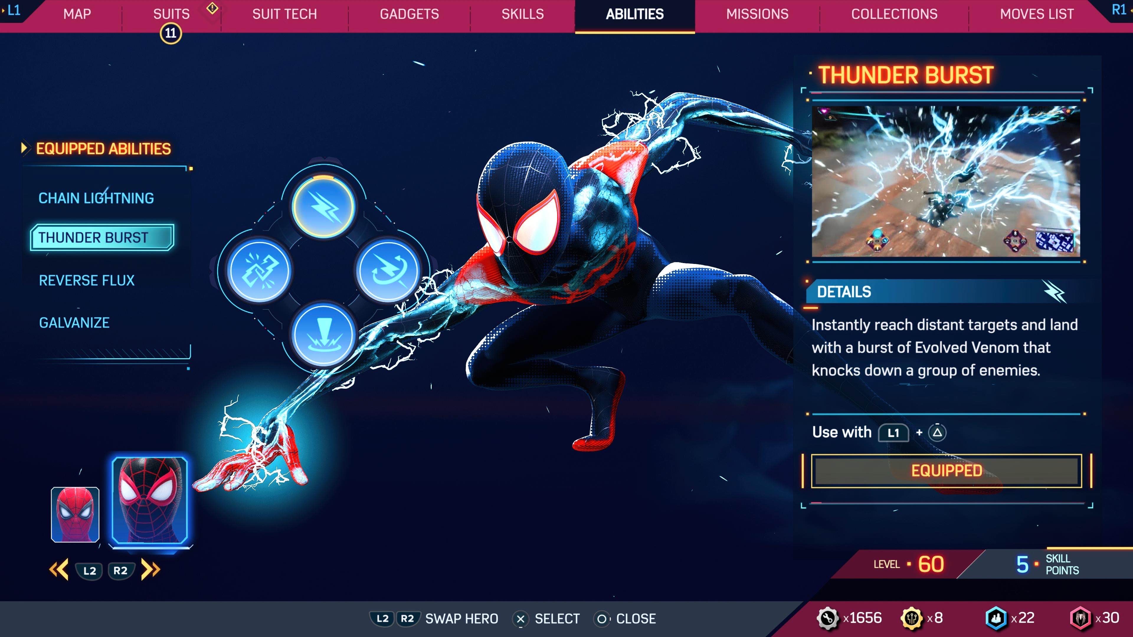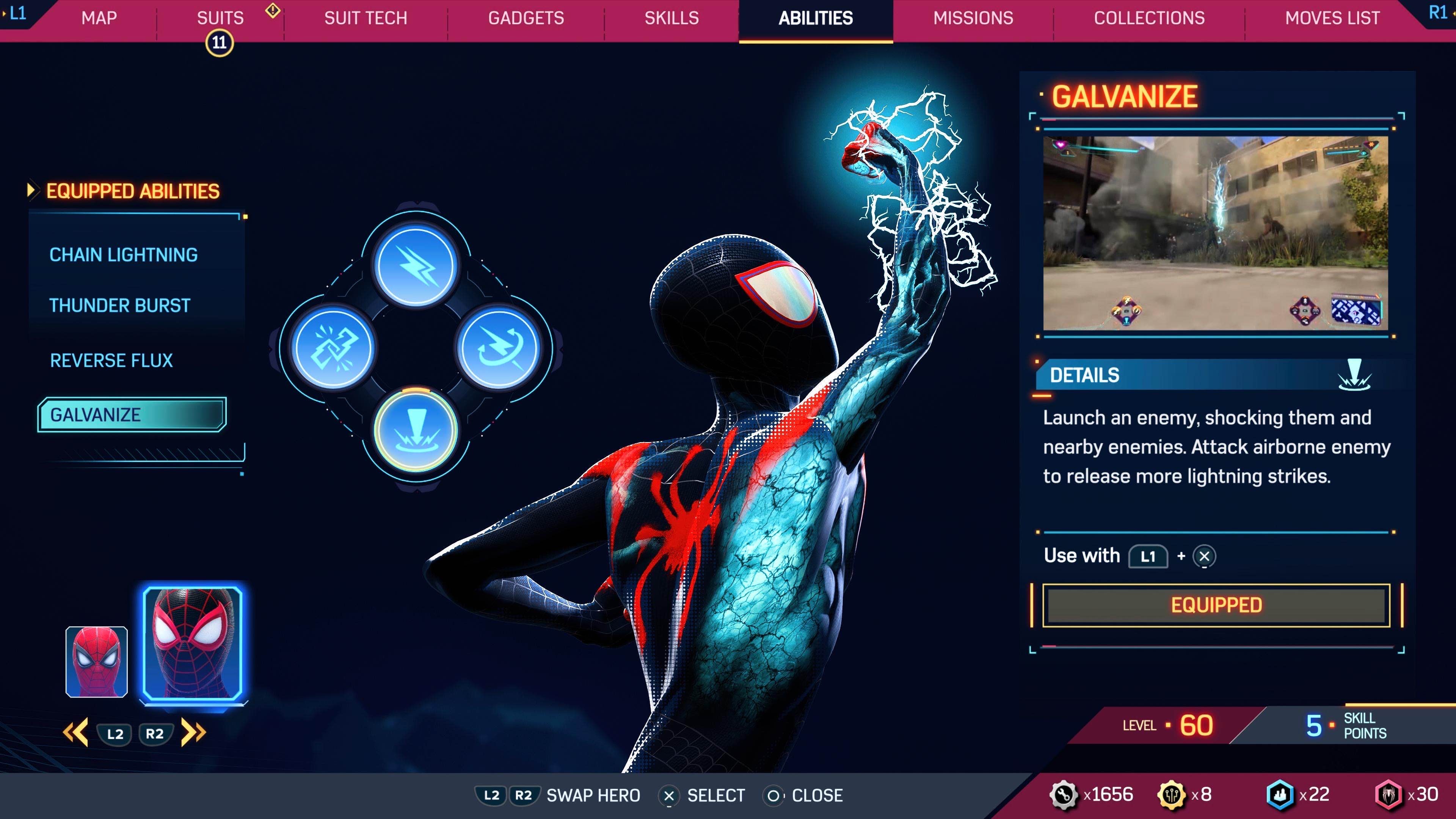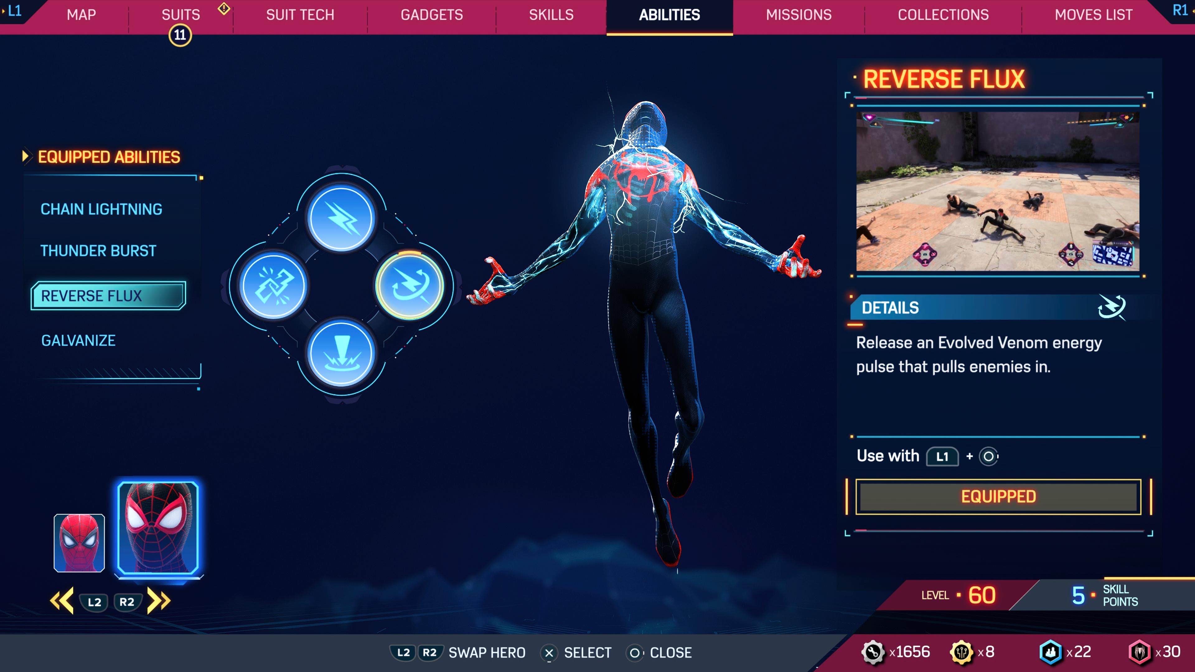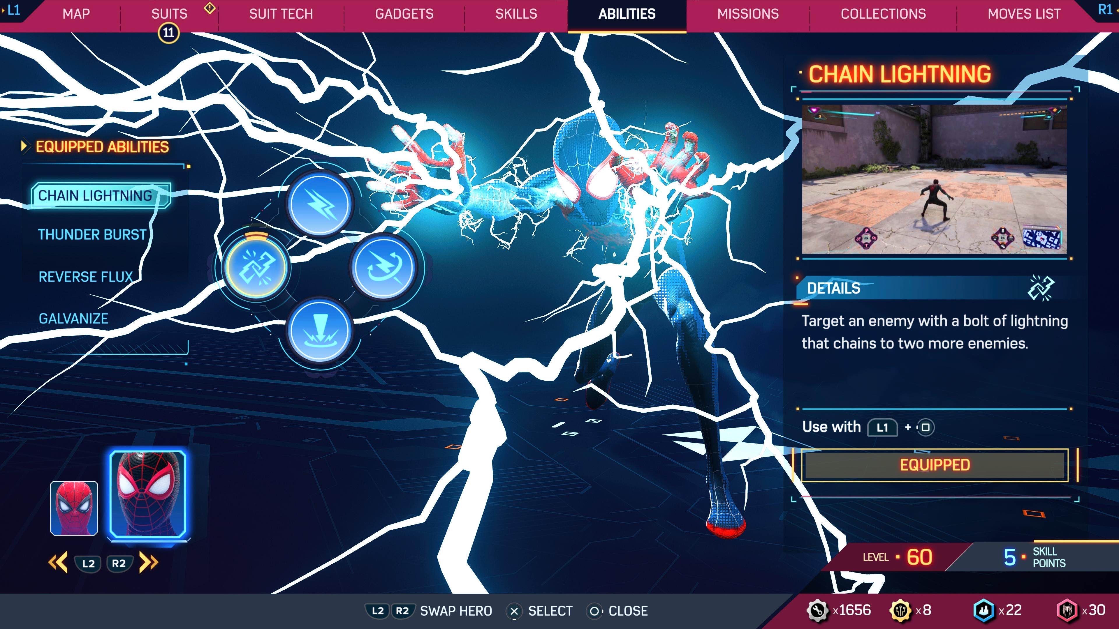 Marvel's Spider-Man 2 features an Abilities menu, where the player can manage and equip abilities for both Peter Parker and Miles Morales to use in combat.
